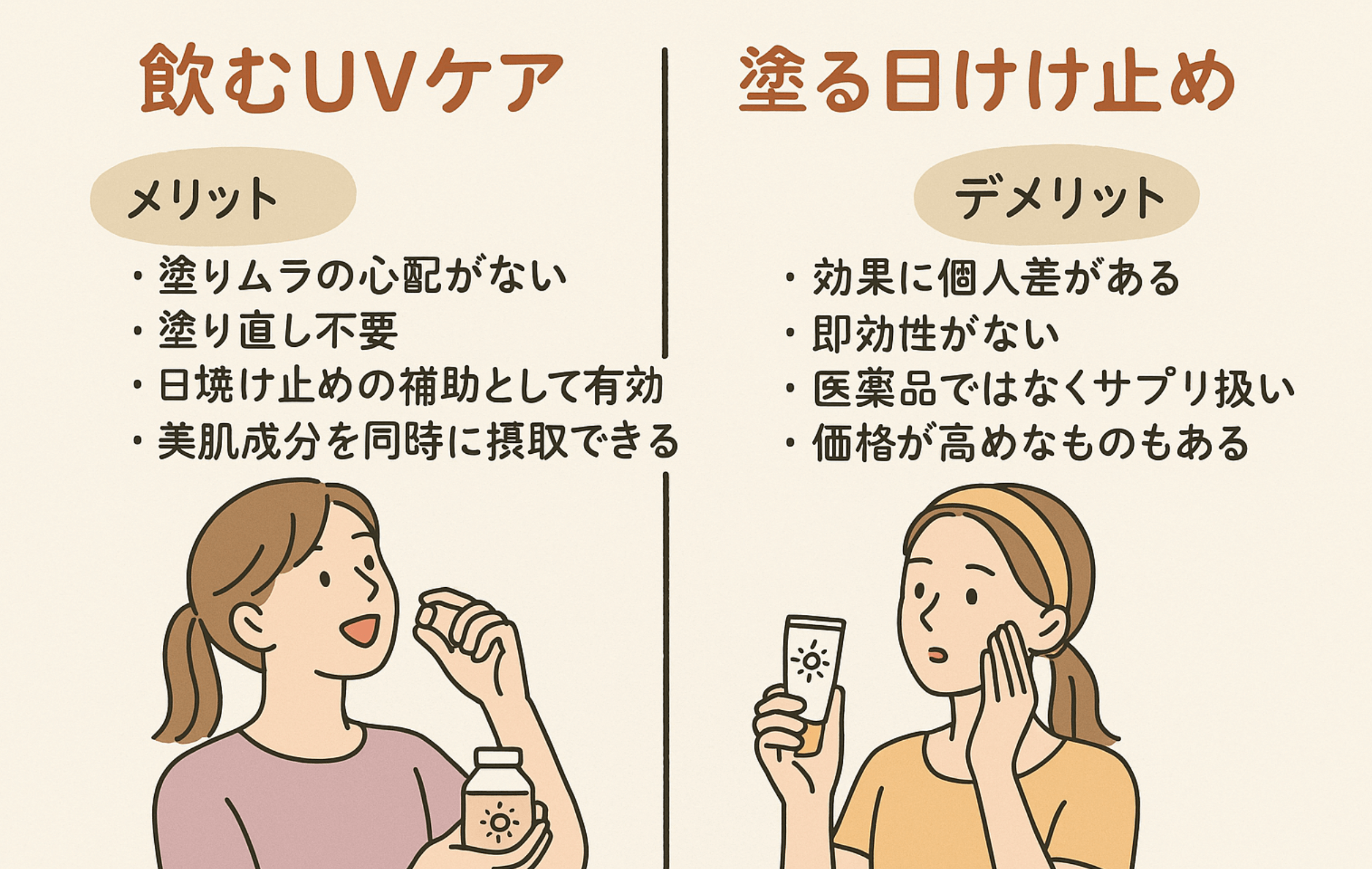 이번에는 그런 "마시는 UV 케어"의 장점과 단점을, 그림과 함께 알기 쉽게 소개합니다!